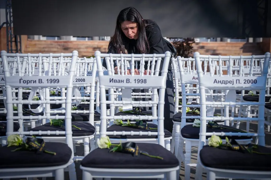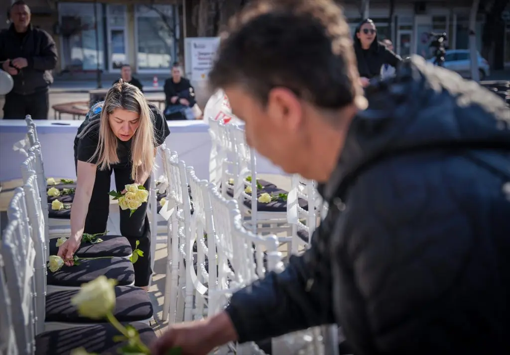 Postavljanje 63 bijele stolice u znak sjećanja na 63 žrtve tragedije organizovali su Opština Kočani i roditelji poginulih.
