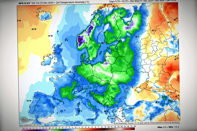 Za Europu se u siječnju pritom prognozira uspostava polja povišenog tlaka nad sjevernim dijelovima kontinenta, uz niži tlak nad južnijim i središnjim područjima. Takav raspored potiče sjeverna i sjeveroistočna strujanja, koja donose ispodprosječne temperature u velik dio Europe. U tom se kontekstu i područje Hrvatske nalazi na rubu hladnijeg kontinentalnog utjecaja, što znači nastavak niskih temperatura, osobito noću i ujutro, uz česte minuse u unutrašnjosti.