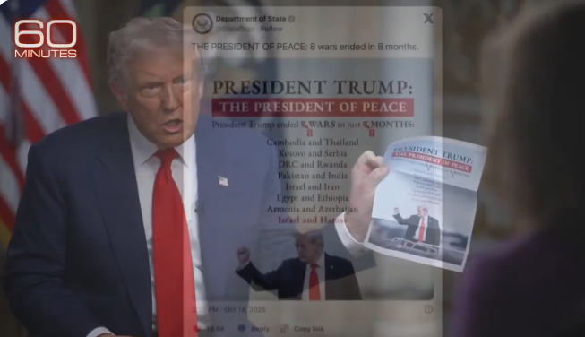 Predsjednik SAD-a Donald Trump gostovao je u emisiji "60 minuta" na televiziji CBS i ponovo iskoristio priliku da saopšti kako je "riješio osam od devet ratova" širom svijeta,. On je pri tome pokazao novinarima papir s spiskom konflikata za koje tvrdi da ih je okončao tokom svog prvog mandata.