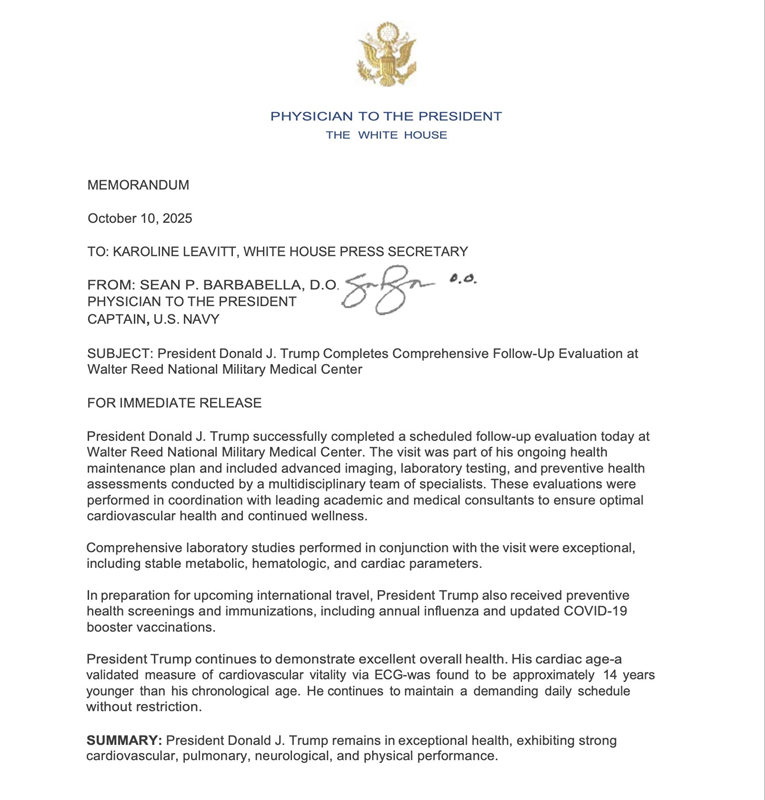 Trumpov liječnik Sean P. Barbarella naveo je u dokumentu od jedne stranice da Trump “ostaje u iznimnom zdravstvenom stanju, pokazujući snažne kardiovaskularne, plućne, neurološke i fizičke performanse”.